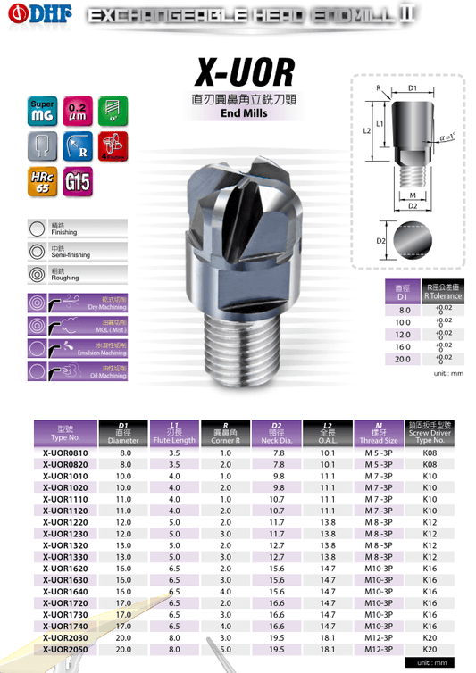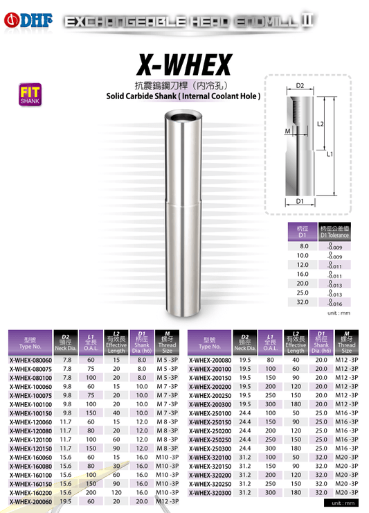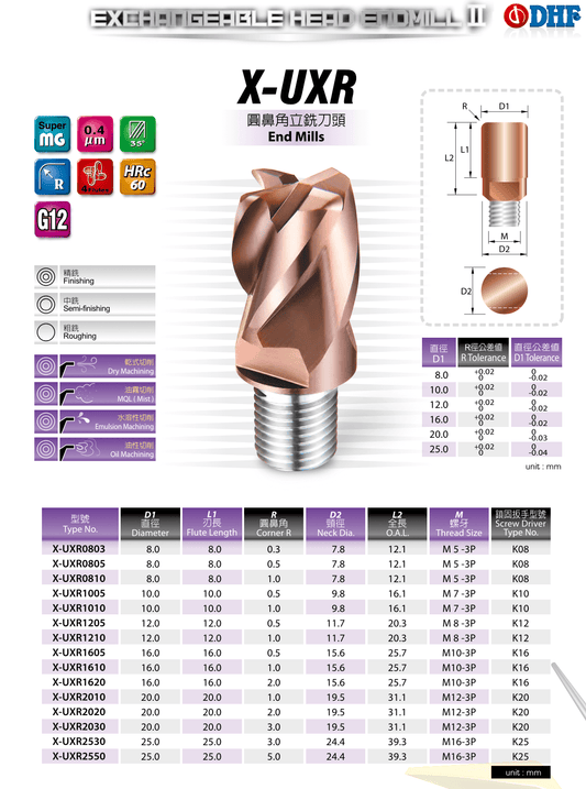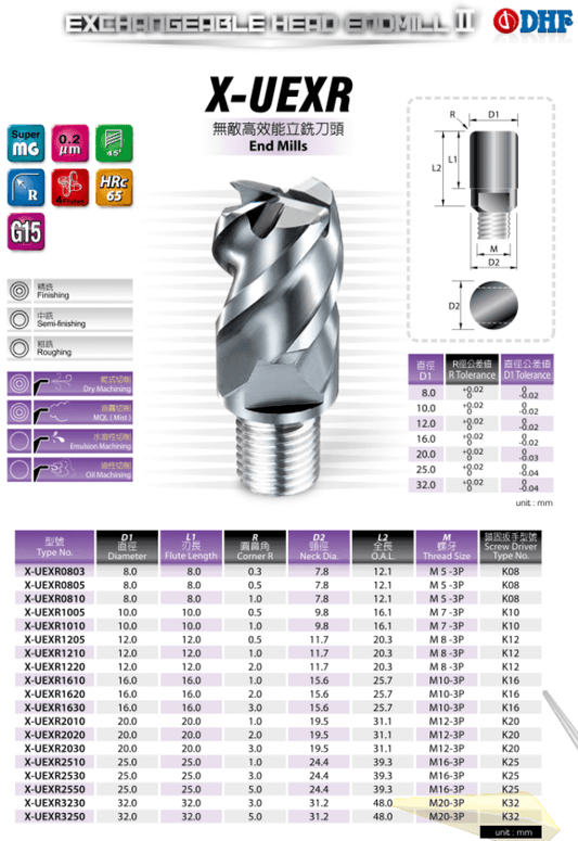 DHF propone questa linea di frese a testa intercambiabile che permettono di riutilizzare il gambo della fresa, cambiandone solo la testa per le varie lavorazioni. È possibile scegliere la testa intercambiabile specifica per la lavorazione che si deve eseguire, montandola facilmente sul gambo riutilizzabile.