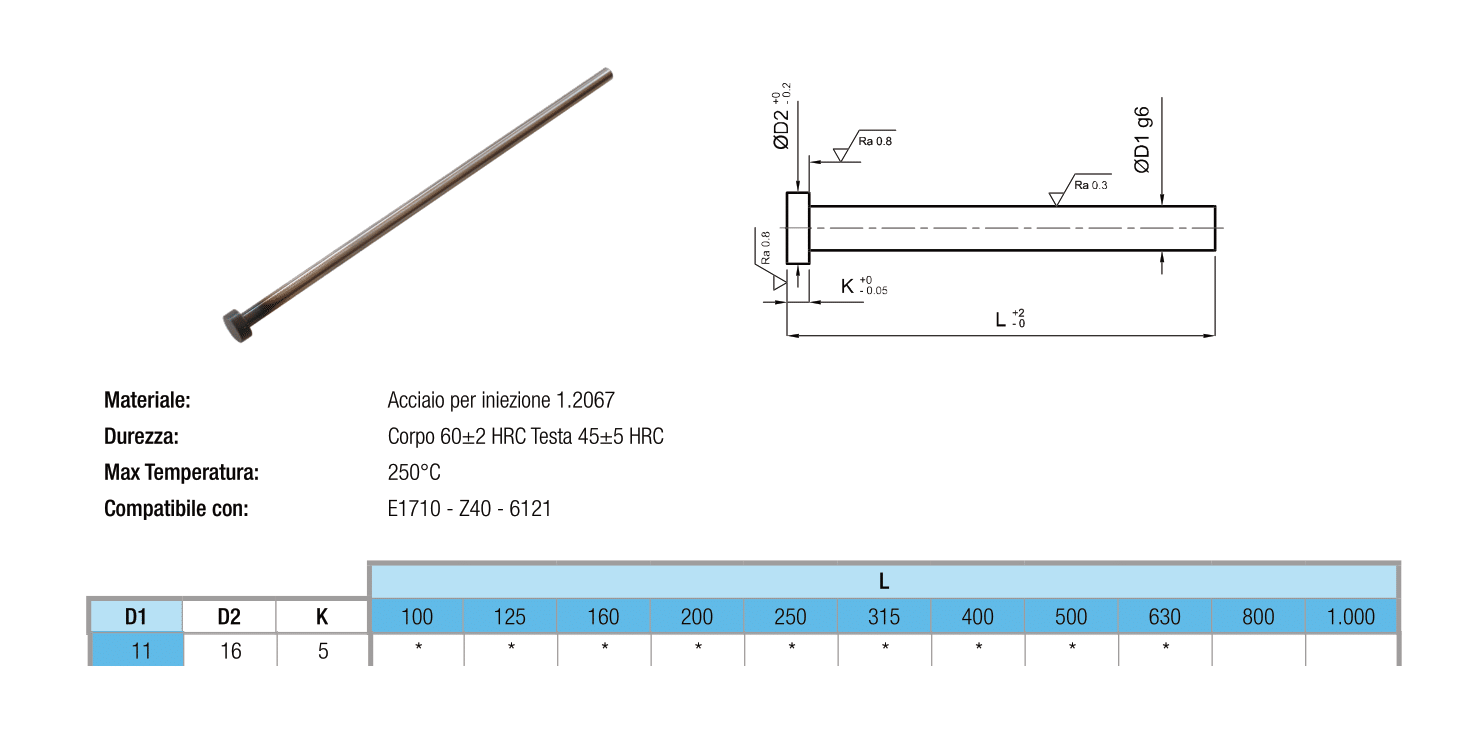 Espulsore a testa cilindrica temprato per l'estrazione in stampi a iniezione di plastica