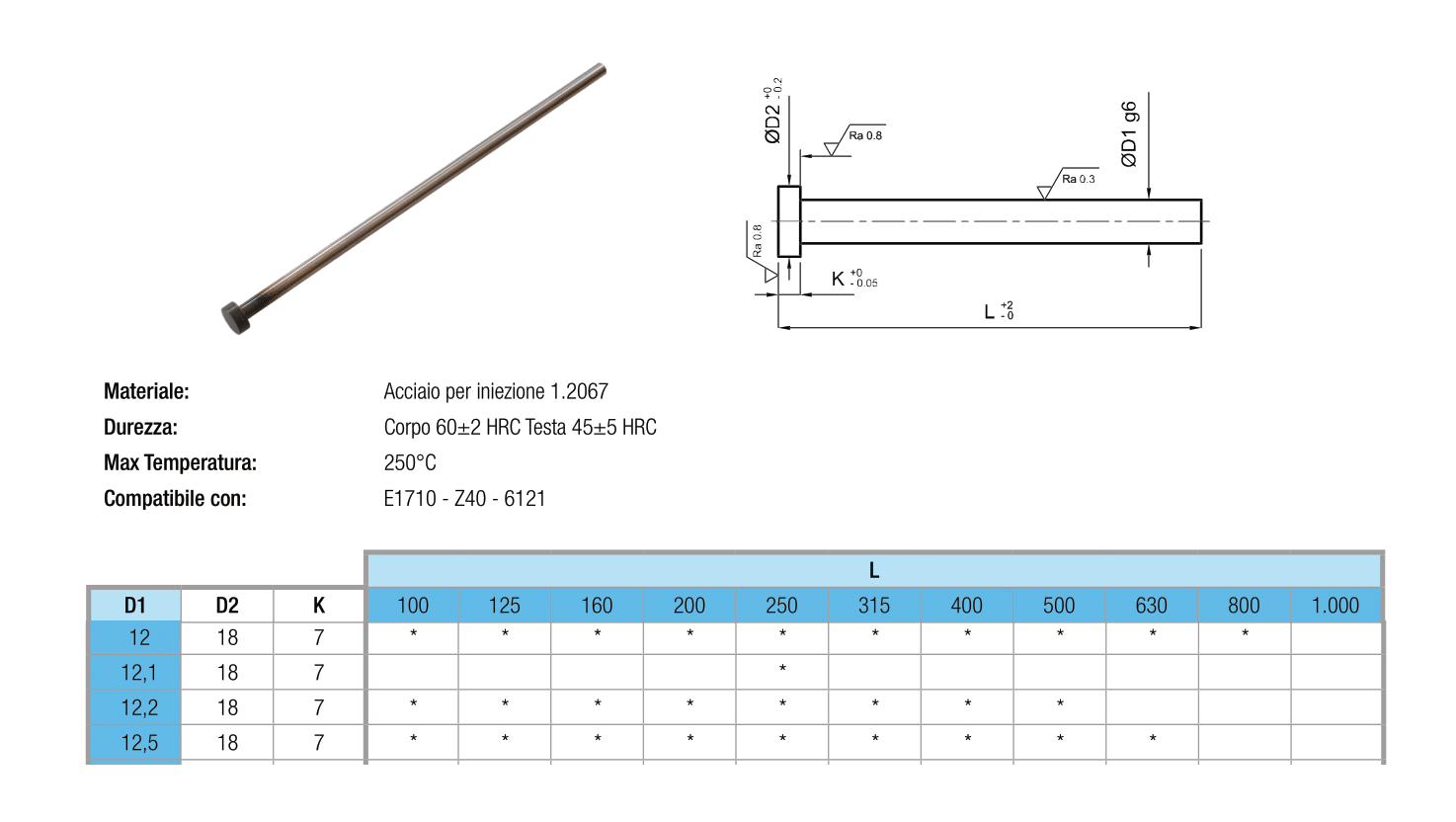Espulsore a testa cilindrica temprato per l'estrazione in stampi a iniezione di plastica