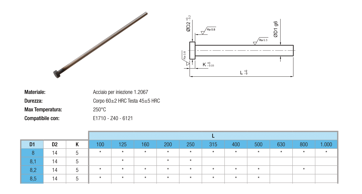 Espulsore a testa cilindrica temprato per l'estrazione in stampi a iniezione di plastica