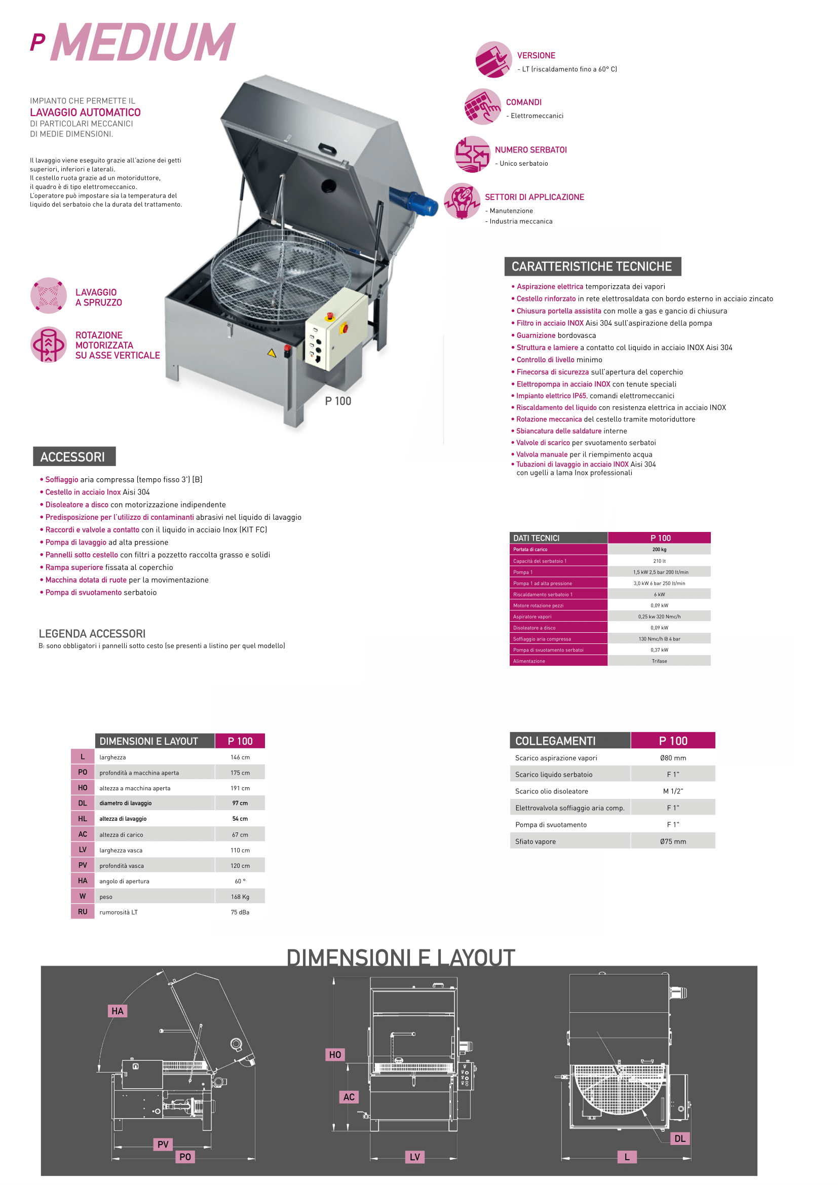 Il lavaggio viene eseguito grazie all’azione dei getti superiori, inferiori e laterali. Il cestello ruota grazie ad un motoriduttore, il quadro è di tipo elettromeccanico. L’operatore può impostare sia la temperatura del liquido del serbatoio che la durata del trattamento.