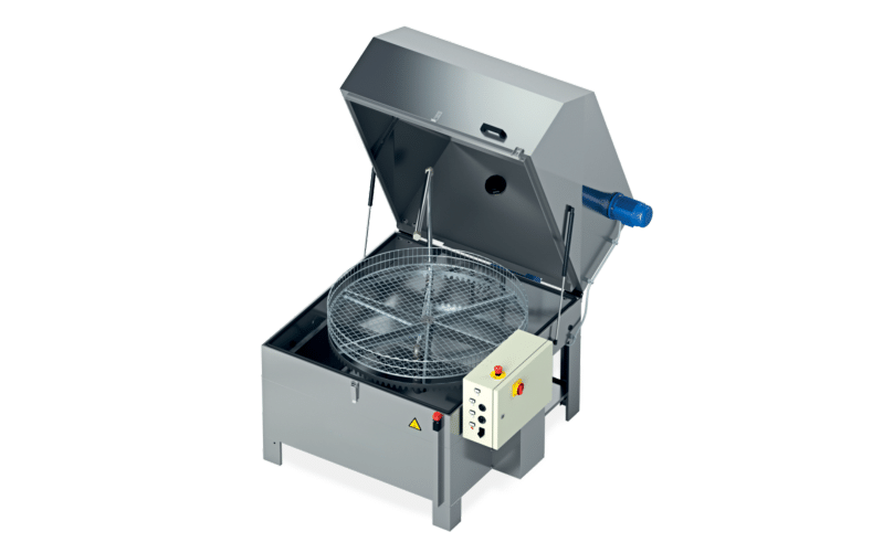 Il lavaggio viene eseguito grazie all’azione dei getti superiori, inferiori e laterali. Il cestello ruota grazie ad un motoriduttore, il quadro è di tipo elettromeccanico. L’operatore può impostare sia la temperatura del liquido del serbatoio che la durata del trattamento.