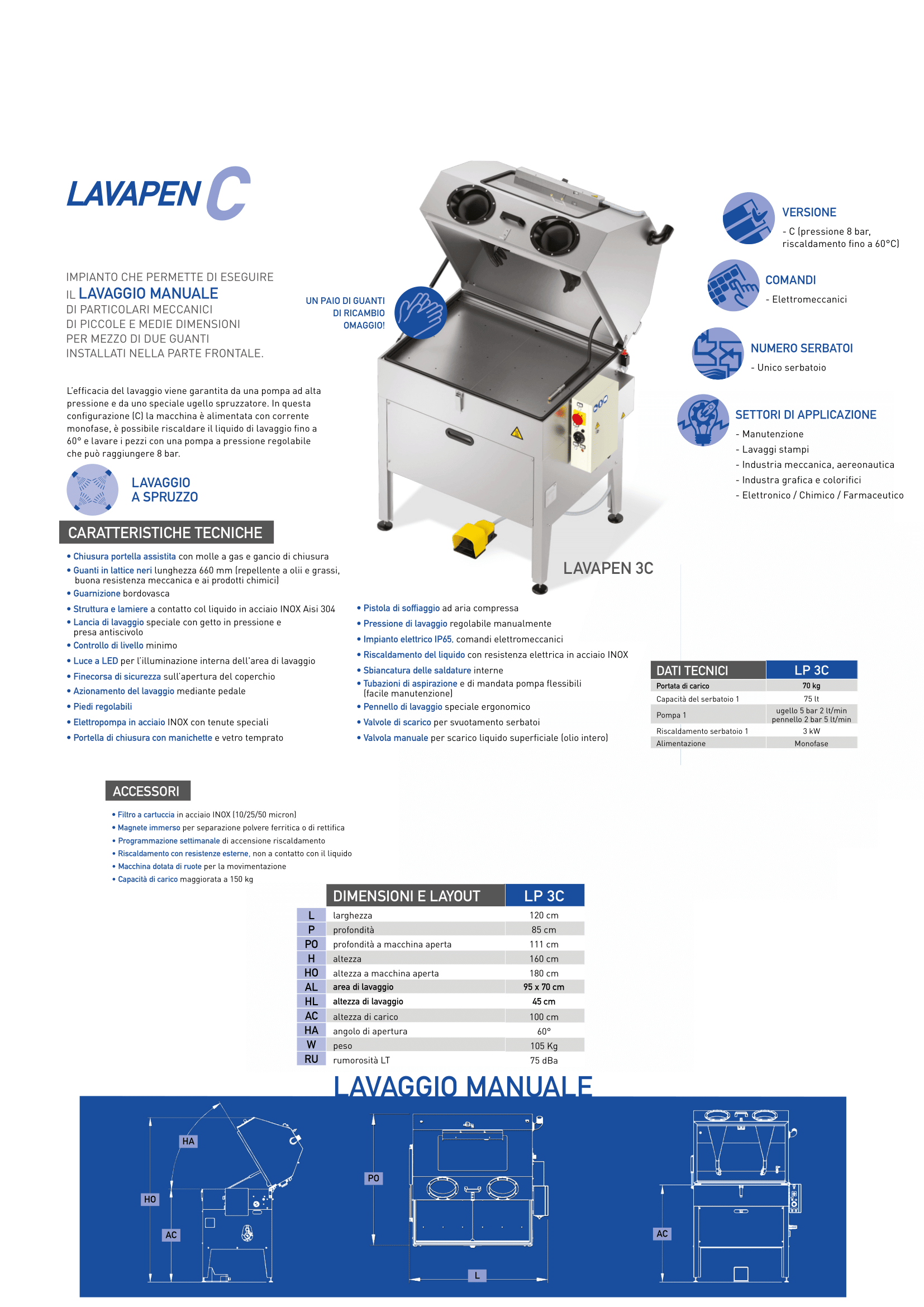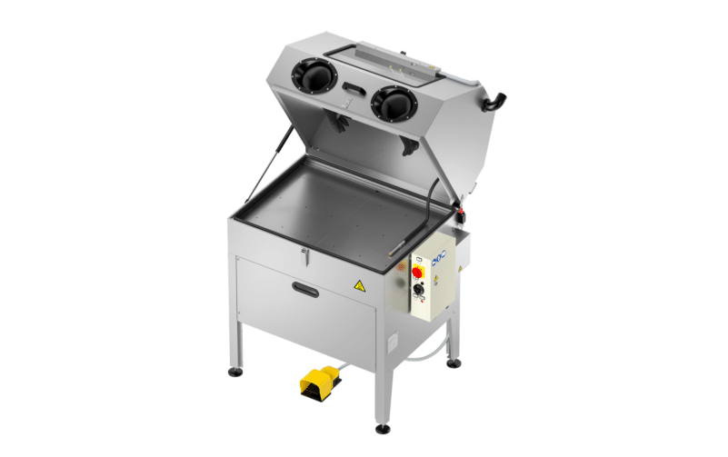 Questo impianto permette di eseguire il lavaggio manuale di particolari meccanici di piccole e medie dimensioni per mezzo di due guanti installati nella parte frontale.
