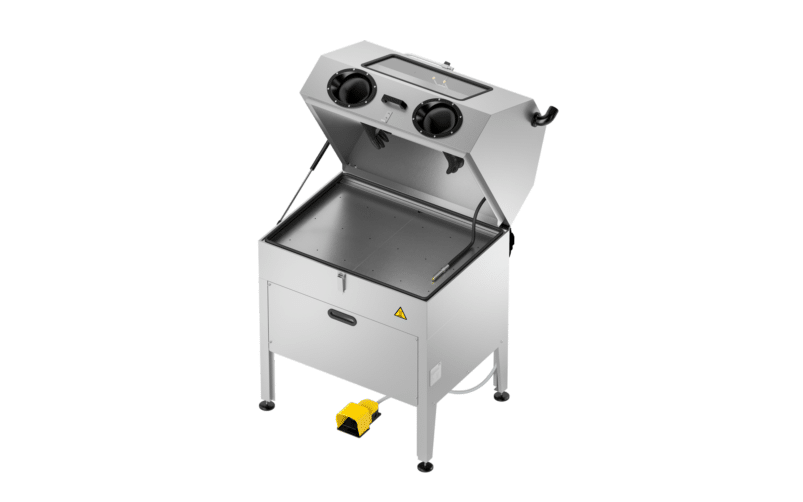 Questo impianto permette di eseguire il lavaggio manuale di particolari meccanici di piccole e medie dimensioni per mezzo di due guanti installati nella parte frontale.